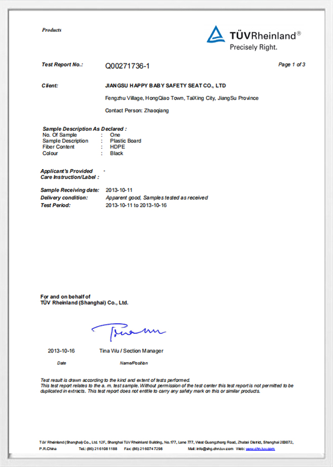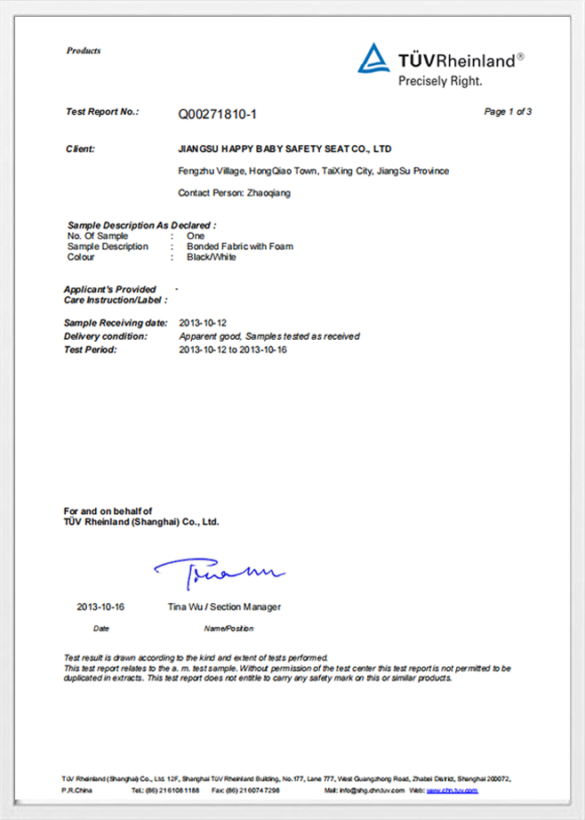 Okrem fyzickej štruktúry riadime prísny dohľad našich partnerských závodov. Každý komponent prechádza priebežne Fyzikálne a chemické testovanie aby sa zabezpečila absencia škodlivých látok a zabezpečilo sa, že látky v kontakte s pokožkou dieťaťa sú rovnako bezpečné ako pohodlné.